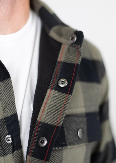 Built from a tough-wearing 6.5oz yarn dyed cotton flannel and insulated with a micro polar fleece lining this piece does campfires and post-surf warming up better than anything. We added convenient snap buttons to make bundling up that much easier when those hands don't seem to work like they used to after a long surf. Available in two colors, Red and Green - and trust us, you don't want to miss out.